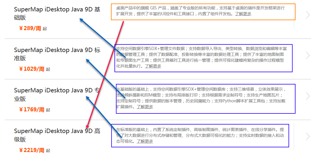 "summary" : "桌面产品中的旗舰 GIS 产品,涵盖了专业版的所有功能,支持基于桌面的插件是开发框架进行扩展开发,提供了丰富的UI控件和工具接口,内置了组件开发包。"