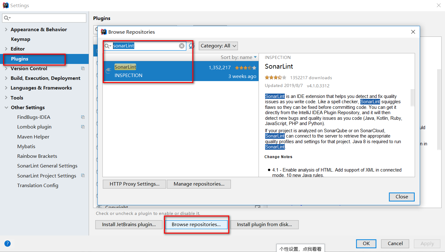 sonar分为服务端和客户端,服务端公司已经搭好,拥有自己的校验规则,我们这里只安装客户端,idea插件sonarlint集成###1.下载sonarLint插件