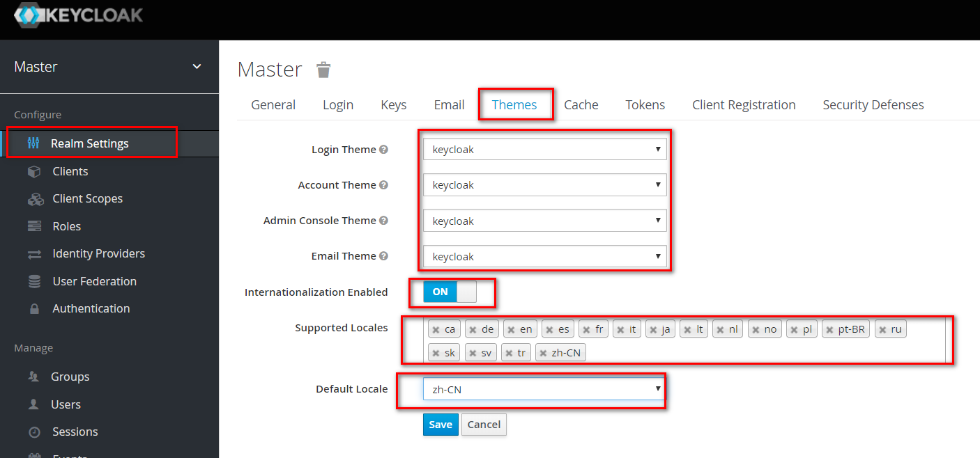 “Login Theme”项、“Account Theme”项、“Admin Console Theme”项、“Email Theme”项全部选择“keycloak”,