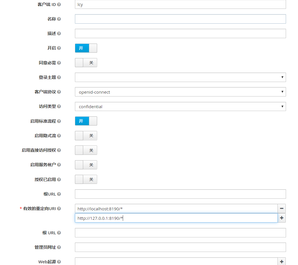 “有效的重定向 URL”是填写 Keycloak 所允许的哪些应用(业务)系统(URL)能够使用 Keycloak 的认证授权服务,支持填写多个,填写格式建议为:服务根地址后面加上/*号。
