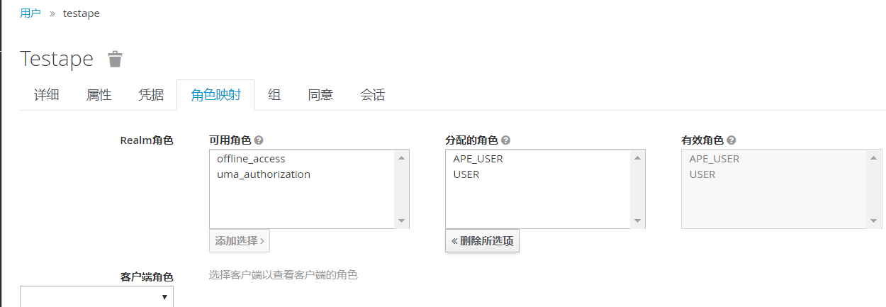 说明:kc下有一个用户 , 拥有 KC_APE_USER,KC_USER的角色