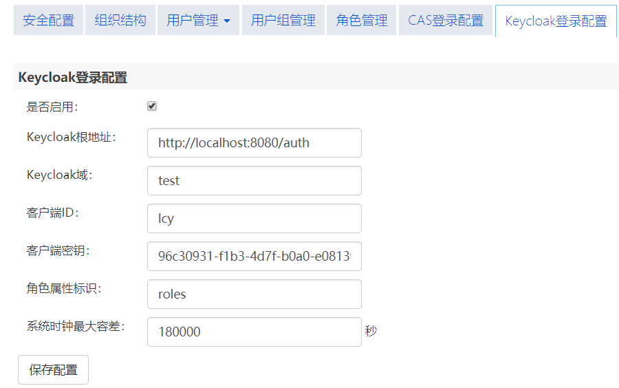 5. 客户端密钥:输入在 Keycloak 中创建客户端时生成的客户端密钥,例如:334322d9-45d2-45e9-8e49-156f188ef0f4。