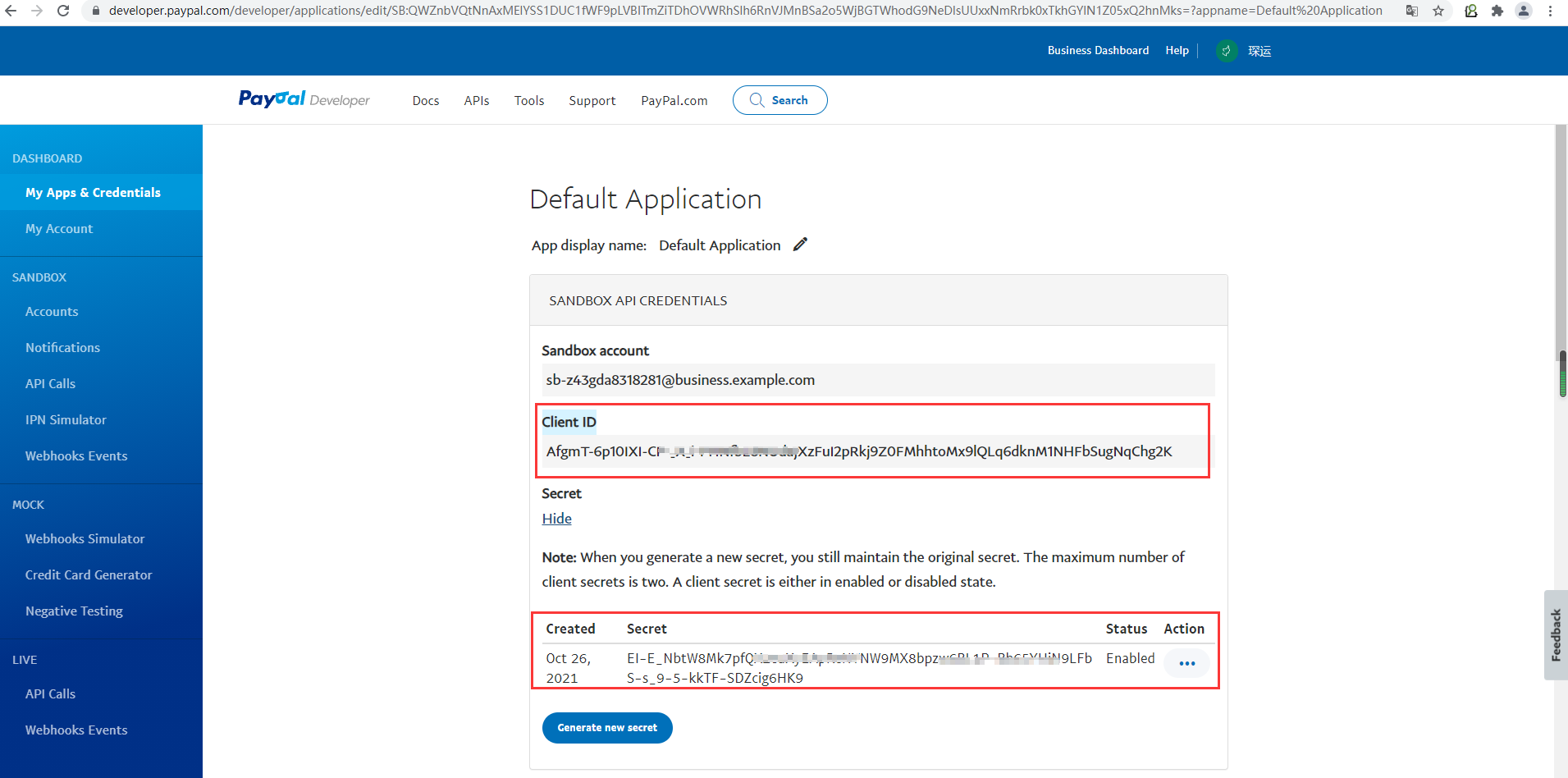 得到 client ID 和 secret 信息###2.沙箱账号
